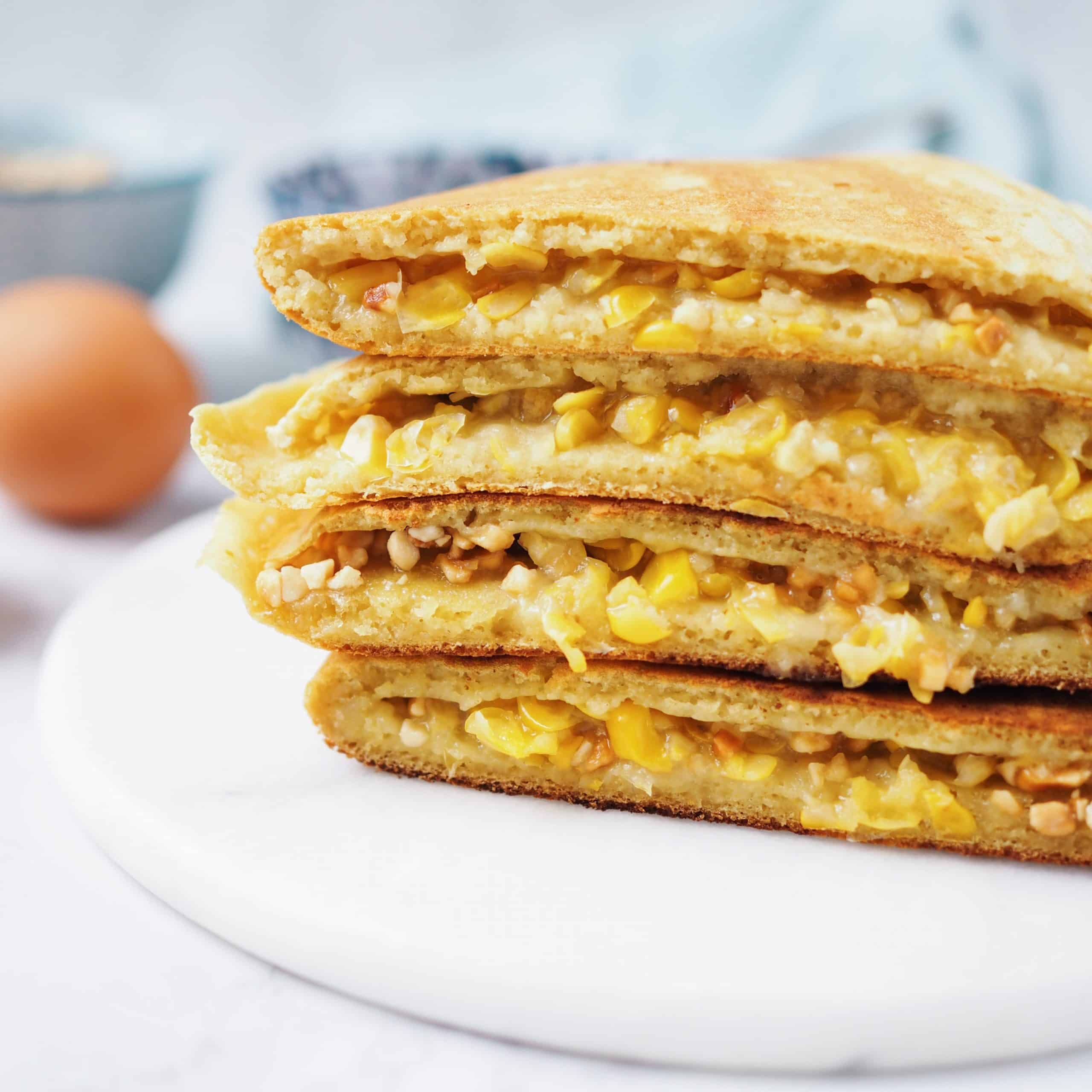 Apam Balik. A delicious Asian street food pancake filled with sweet creamed corn, peanuts, sugar and butter. Easy to make with simple ingredients. Great as dessert, breakfast or as a snack for the whole family! [Dairy-free adaptable]