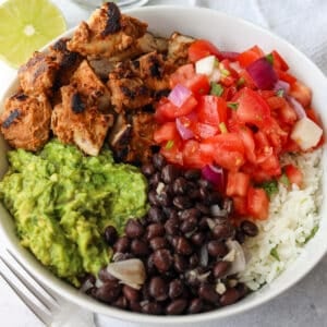 Their grilled chicken is best served in a burrito bowl with cilantro lime rice, black beans, pico de gallo or salsa, guacamole, fresh lime juice, and sour cream. It's also served in tacos, quesadillas, or with salad.