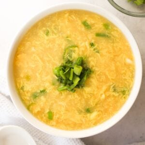 Egg drop soup is a classic Chinese soup with beautiful egg ribbons simmered in a thickened chicken broth with a hint of sesame oil and green onions. This popular soup originates from China and is served at Chinese restaurants or ordered for takeout.