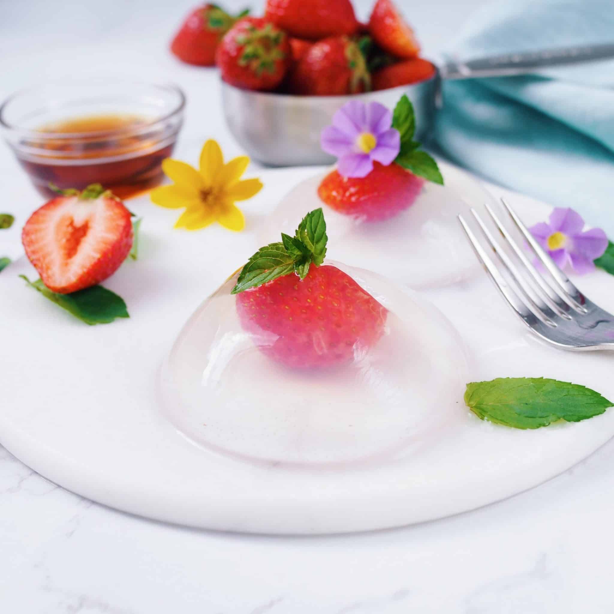 Japanese Raindrop Cake. A fun and refreshing jelly water cake with strawberry and served with maple syrup. This delicious dessert is vegan and easily made with 4 simple ingredients!