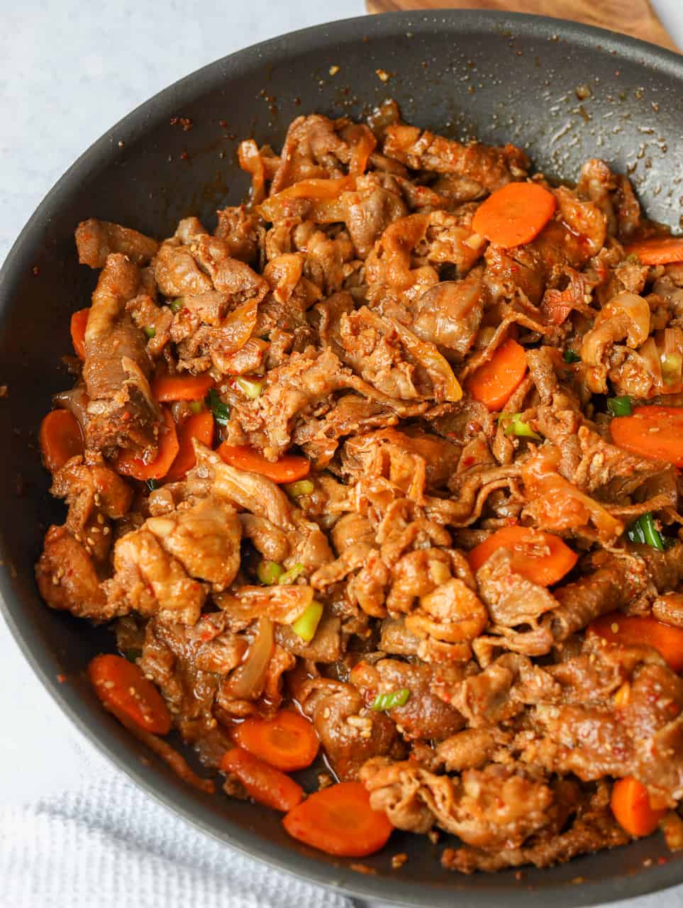 Tender pork stir-fried in a spicy, sweet and smoky sauce with onions, carrots, and garlic. This quick and easy jeyuk bokkeum is ready in 25 minutes in one pan! Say goodbye to expensive Korean BBQ and make this at home!