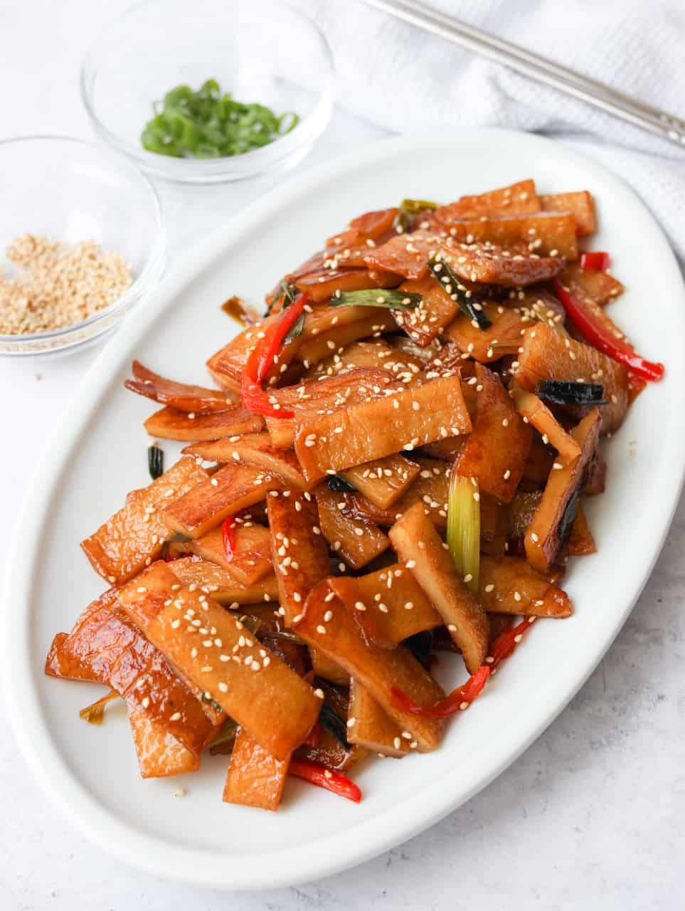 Tender fish cakes stir fried in a sweet and savoury sesame sauce with green onions and bell peppers. This quick and easy Korean fish cake stir-fry is ready in 10 minutes! A great Korean side dish that is packed with flavor!