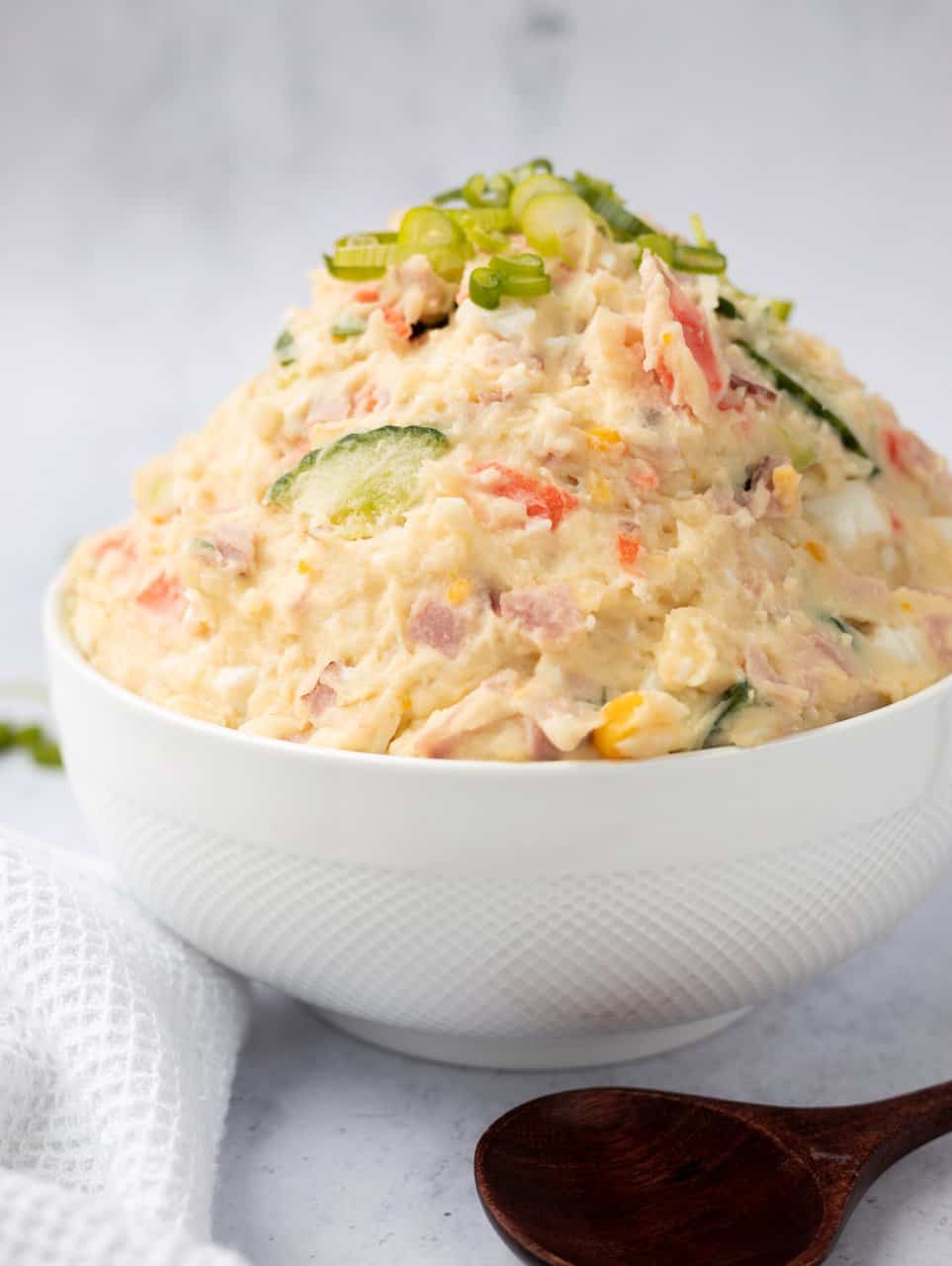 - Then add cucumbers, ham, carrots, corn, green onions, Kewpie mayo, salt and sugar to the potato mixture. Combine everything together with a spatula. Chill for at least 1 hour or if you'd like, enjoy immediately.
