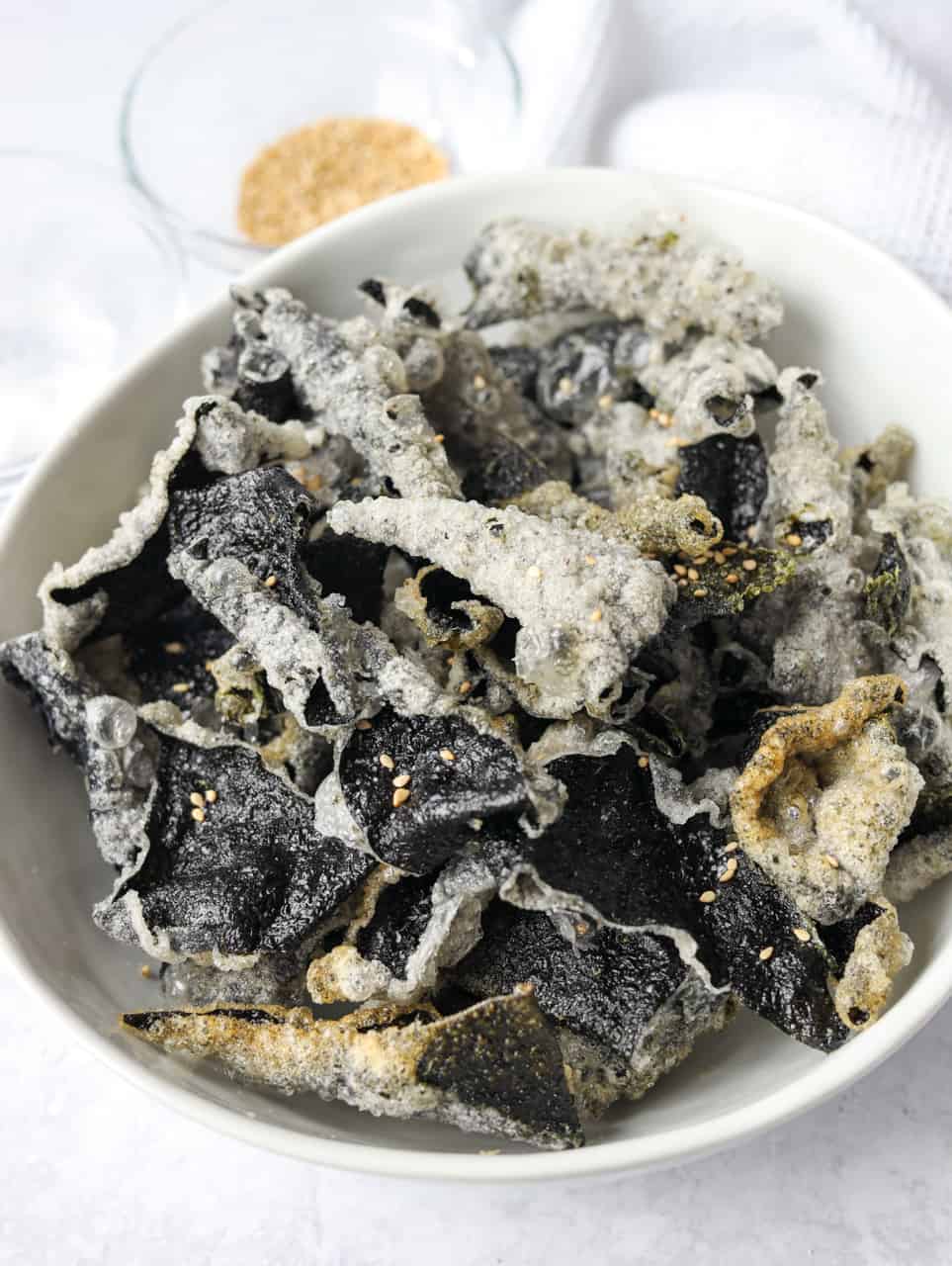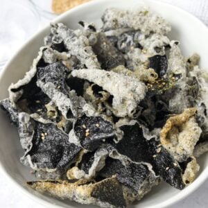Crunchy deep-fried roasted seaweed and seasoned rice paper with garlic, onion and sesame flavors! These easy Korean seaweed chips are an addictive and umami tasting snack. You can make them at a fraction of the cost of store bought chips!