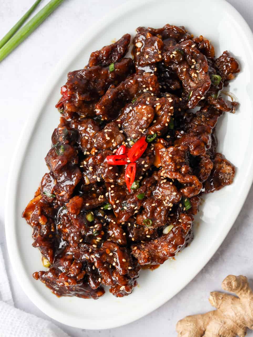 - Toss in fried beef and garnish with green onions. Remove off heat. Optionally garnish with sesame seeds. Enjoy!