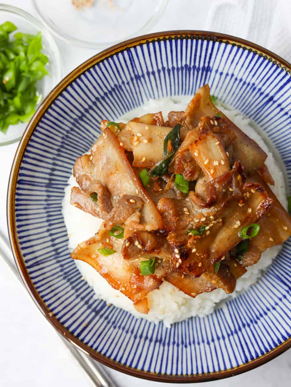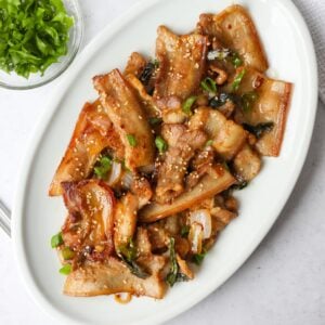 Pork Bulgogi is a delicious and popular Korean main featuring pork belly marinated in a sweet, sesame, soy sauce with garlic and onions! There is also a spicy version called Jeyuk Bokkeum, which is very similar but contains spicy gochujang and gochugaru.