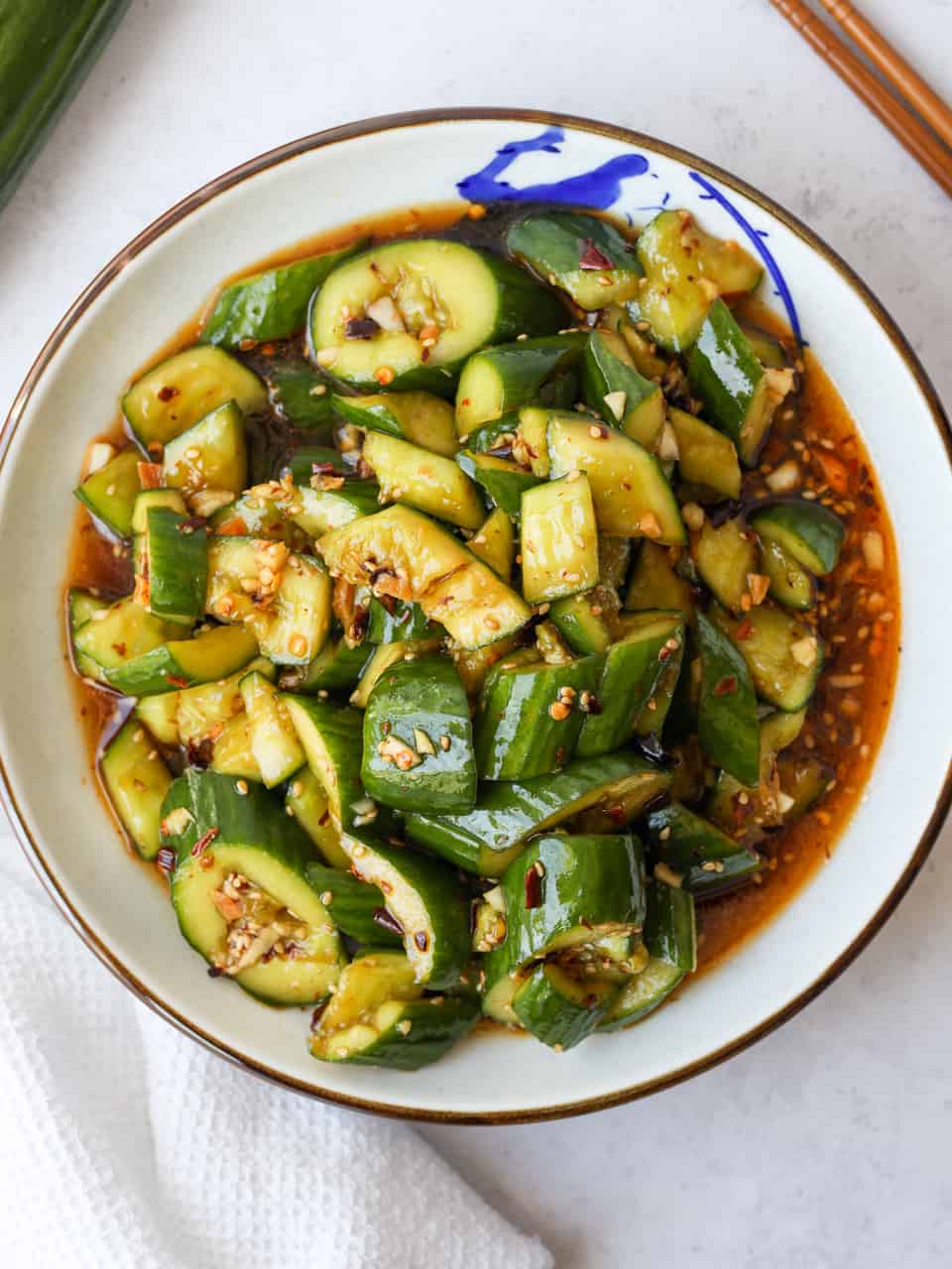Refreshing cucumbers seasoned in a savory, spicy, garlicky sauce. This quick and easy spicy smacked cucumber salad recipe uses minimal ingredients and is ready in 10 minutes! A delicious vegetable side dish that's budget-friendly, restaurant quality, and meal-prep friendly.