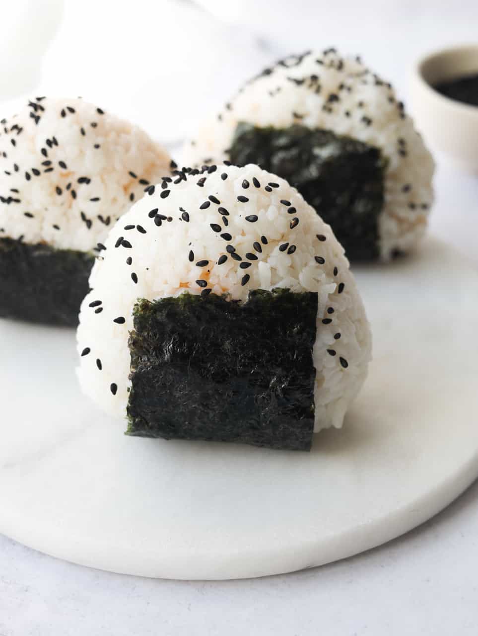 - Remove the triangle rice ball from the plastic wrap and stick the rough side of the nori strip on the base of the ball starting from the middle down. Garnish with black sesame seeds and enjoy fresh!
