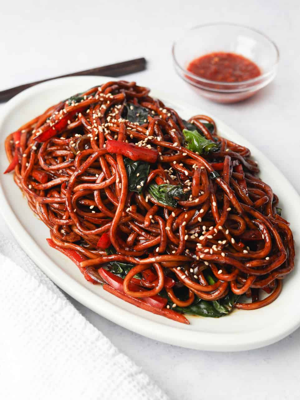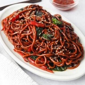 The key ingredient in making this lo mein spicy is chili garlic sauce (aka sambal oelek)! It's a red Indonesian sauce made of red chilis and garlic and sold at Asian grocery stores or online. You can also make it at home with my recipe here.