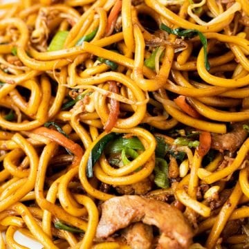 Bami Goreng. Indonesian stir-fried thick chewy egg noodles in a sweet savoury sauce paired with tender chicken, mung bean sprouts, garlic chives, carrots, green onions and garlic. An aromatic and delicious dish that is ready in just 30 minutes! Perfect for dinner or lunch. This dish originates from Indonesia.